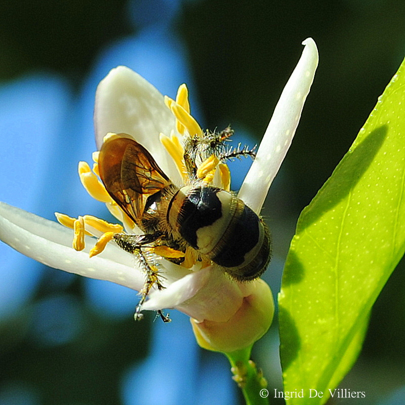 A yellow jacket bee on a lemon tree blossom